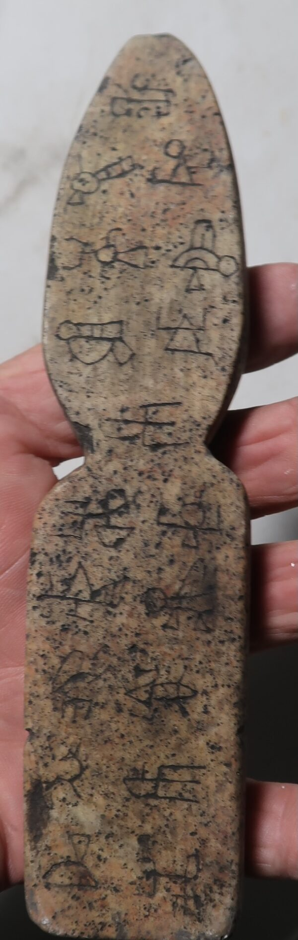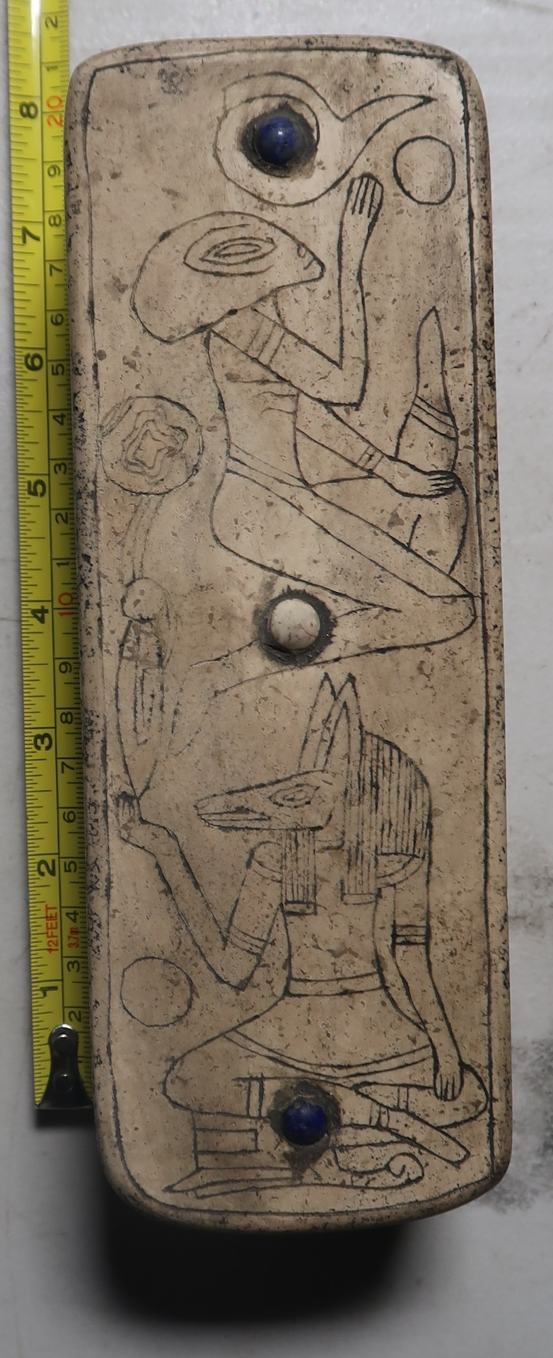Etched upon the top surface are two kneeling beings, their forms reminiscent of Egyptian deities yet unmistakably otherworldly. Each raises a hand in invocation, while their elongated craniums and orbital eyes hint at origins beyond the Nile.