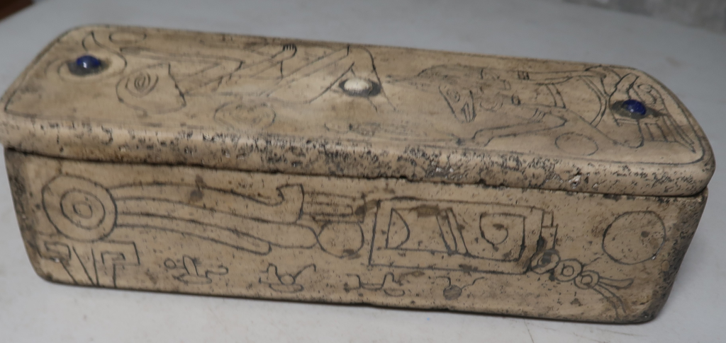 It is believed to represent a visitor who once came “cloaked in light,” offering knowledge before returning to the sky. The inside lid is inscribed with further glyphs—denser, more compact—often interpreted as the prayer of awakening recited before the Witness was placed to rest.