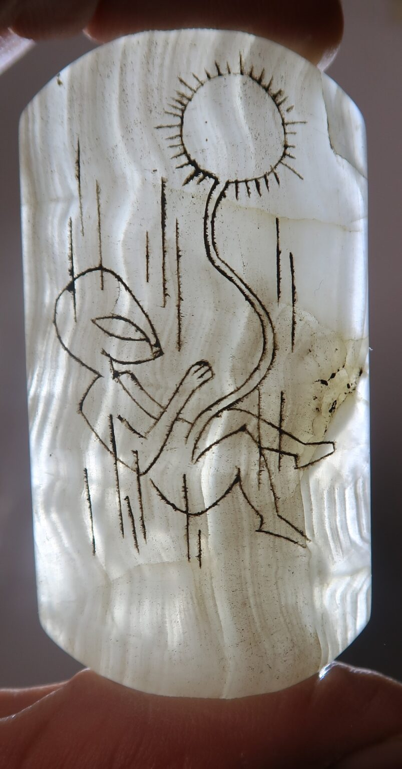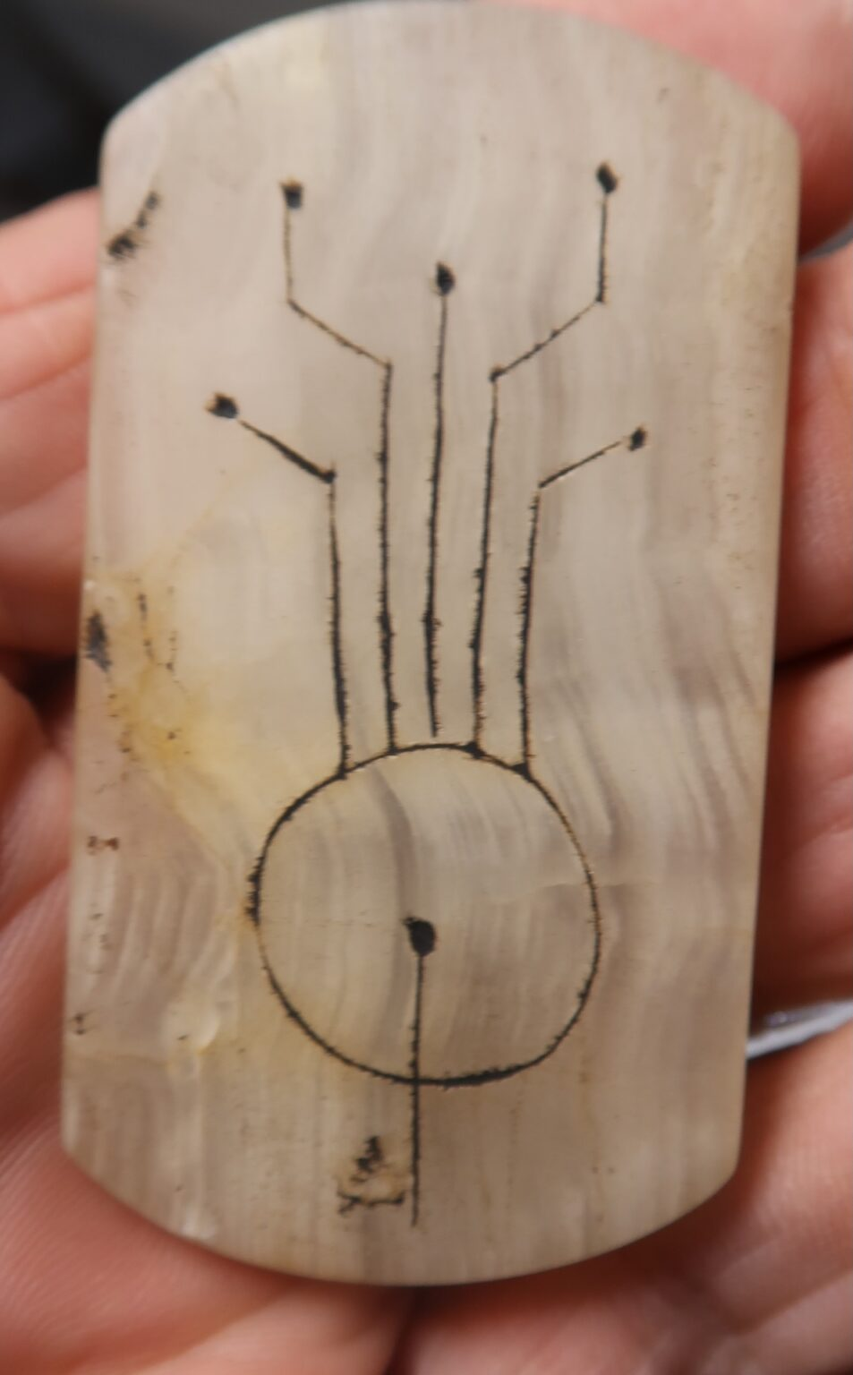 On the reverse, a circular core sends branching lines outward, mirroring the act of transmission or reception. Light passing through the stone gives the impression that the symbols are not merely carved, but embedded—waiting to be read when conditions are right.