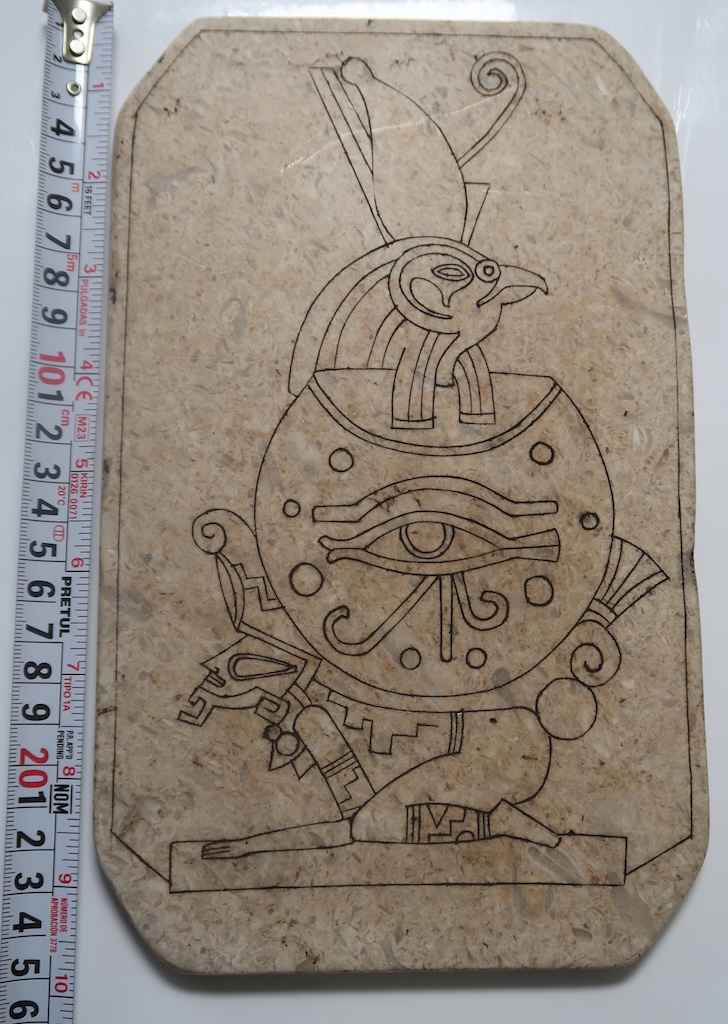 This tablet presents a solitary figure whose form is both emblem and function, carved with deliberate restraint into a softly mottled stone. The primary face is dominated by a large circular disk held at the figure’s core, within which an all-seeing eye emerges. The eye is not merely decorative; it is framed by flowing lines and small surrounding marks that suggest radiance, awareness, and constant perception. It reads as a symbol of vigilance—of watching not outward alone, but inward and across thresholds unseen.