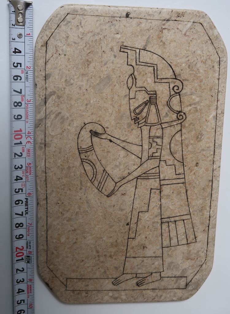 The reverse side simplifies the narrative. Here, the same being is shown in profile, kneeling or seated, holding a curved vessel close to its body. The vessel appears purposeful, as if designed to receive, contain, or pour something intangible. Without the prominent eye-disk, the figure becomes quieter, introspective, suggesting preparation or ritual rather than observation.